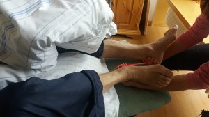 Zu Beginn waren die Beinmuskeln rechts durch die Knie-und Hüftathrose bedingt, derat verspannt – es war schier kein Ausstrecken des Beines möglich.